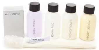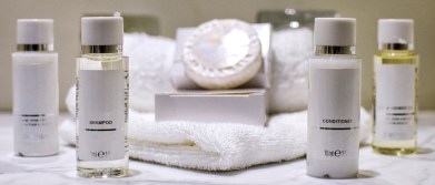 Let’s pause here for a quick survey. What’s the first thing you do when you enter a hotel room – check out the view? Channel-surf the TV? Flop on the bed? Not me. I head to the bathroom to check out the small “freebies” on the counter. Chances are I’ll find (at a minimum) soap for the sink, soap for the shower, boxed tissues, makeup-remover wipes, and maybe even a tiny cloth to polish shoes. Also for the taking: shampoo, conditioner, and body-wash bottles, lined up like little dominoes just waiting to take the plunge into the nearby shower. But guess what? Those little soldiers of sanitation are about to go MIA.