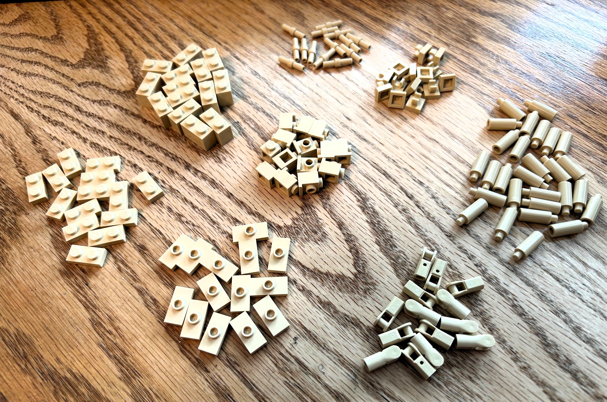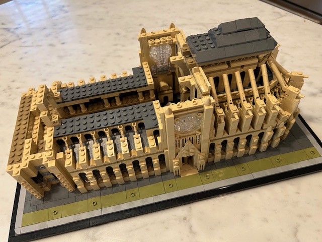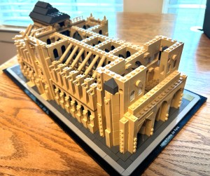 Now for the strange stuff. I assembled a flat L-shaped piece on top of another flat L-shaped piece, only to discover they weren’t supposed to go together that way. No amount of fingernail dexterity could pry those two apart. Fortunately I found myself in the kitchen. Sharp knives everywhere! It took a careful pry without cutting myself but I finally got those two unmarried. Never let it be said building LEGO models isn’t a dangerous sport.