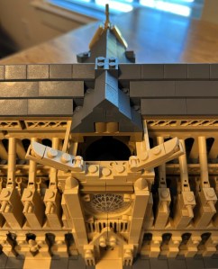 We worked high off the ground today; quite a bit higher than the roof line of the cathedral. My shaking fingers had a sense of vertigo as I added the little drainpipes, railings, and such you see here. I imagined one of those towering mechanical cranes dropping the LEGO pieces into place until, of course, I remembered I was working in the thirteenth century. The word “crane” hadn’t even been invented yet.