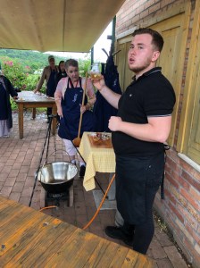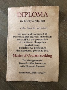 The next day, we took another trip into the countryside for a walk through the several acres of an “open-air museum”, an interesting collection of buildings and settings from Hungary’s storied history. The tour included lunch (hold tight, I know what you’re thinking), but even before lunch we stopped at an outside kitchen for a “special treat” – a demonstration on how to make goulash! (You’ll see I earned a diploma for my efforts.) Then we were hustled into a nearby dining room for our third helping of goulash in twenty-four hours. Part of the restaurant was already set up for a wedding reception later that afternoon. Wonder what they were having for dinner…