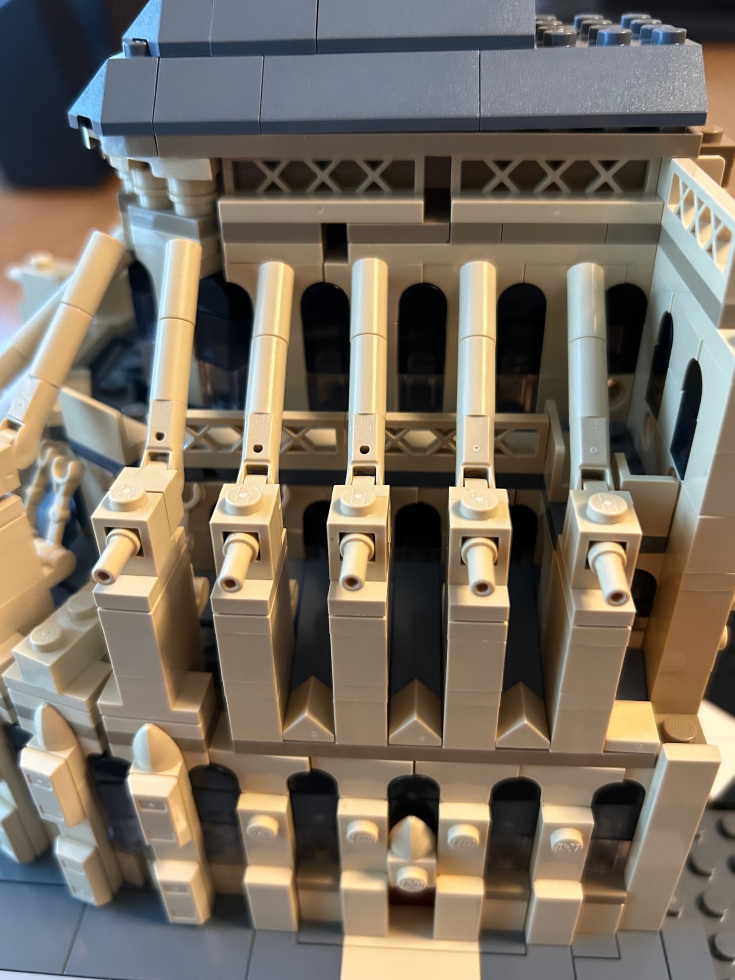 Maybe it was the change of venue but some strange stuff happened today. To begin with, I couldn’t find the very first piece in the build at all, until I looked closer at the instruction manual drawing and realized I was after a tiny statue. Once I found him I was off and running, though I found it sad that one of his companion statues ended up being a leftover piece.