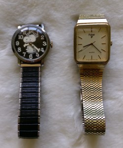 Since we’re talking about analog, I owe my wristwatches a few words. I have eight of them and most stopped ticking a long time ago. Two are also from HP anniversaries (What the heck, were timepieces my only choices?) but three others have more significance. One carries the logo of my father’s seafood restaurant. I still have the Snoopy watch I believe was my very first timepiece (my granddaughter wouldn’t know Snoopy either, sigh). I also have my first “big-boy” watch; a gold Pulsar with matching hands on a cream-colored face. Yes, I may be wearing a sleek digital Fitbit as I type but I always wear one of my analog watches on special occasions. At least, one that still works.